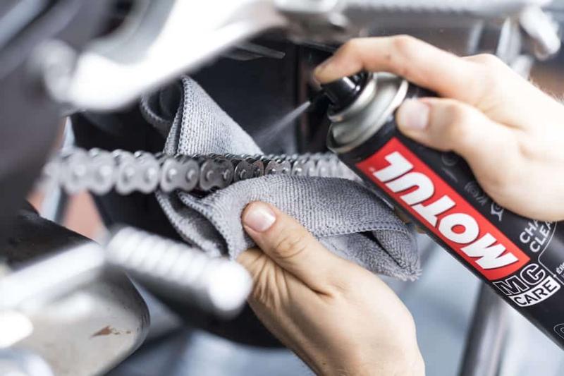 Przed smarowaniem należy najpierw dokładnie wyczyścić łańcuch za pomocą dedykowanej chemii motocyklowej lub miękkiej szczoteczki. Pamiętaj również, aby chronić koło, stosując szmatkę lub karton podczas czyszczenia.